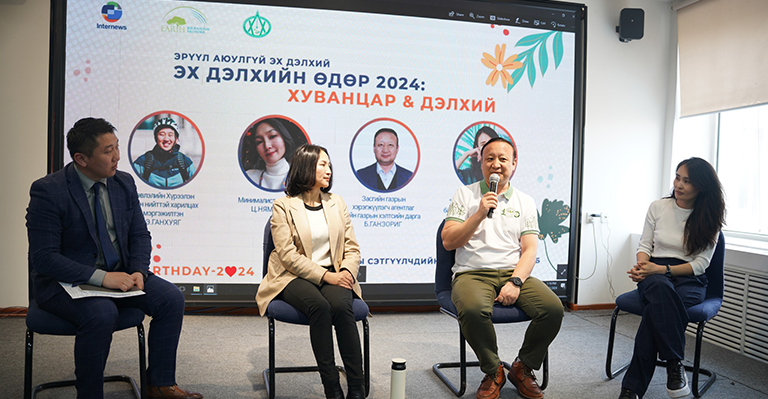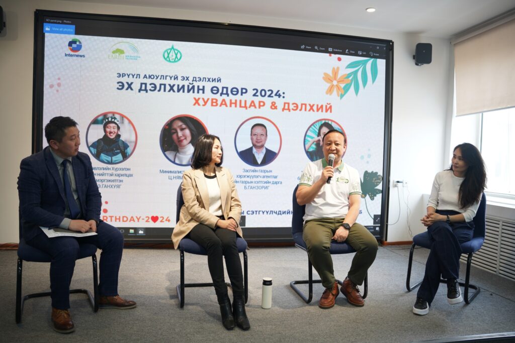 Байгаль орчны сэтгүүлчдийн “Ногоон дэлхий” клубийн гишүүд “Earthday-2024” өдөрт нэгдэж, “ЭРҮҮЛ АЮУЛГҮЙ ЭХ ДЭЛХИЙ” сэдвээр Монгол орны нөхцөл байдлыг ярилцлаа. Засгийн газрын хэрэгжүүлэгч агентлаг Ойн газрын хэлтсийн дарга Б.Ганзориг, хог хаягдлын менежментийн “Өнгө нэм” ТББ-ын үүсгэн байгуулагч, гүйцэтгэх захирал Н.Амгалан-Эрдэнэ, минималист, найруулагч Ц.Нямдулам нар оролцлоо.