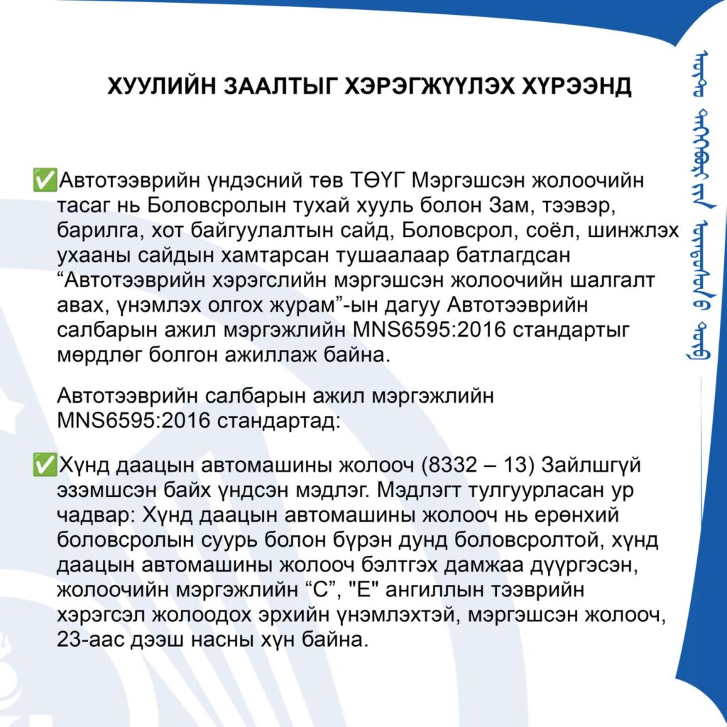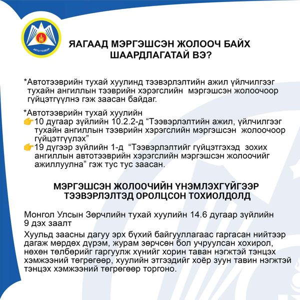 Автотээврийн тухай хуулинд тээвэрлэлтийн ажил үйлчилгээг тухайн ангиллын тээврийн хэрэгслийн мэргэшсэн жолоочоор гүйцэтгүүлнэ гэж заасан байдаг.