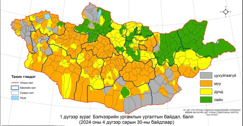 Бэлчээрийн ургамлын ургалтын байдал дөрөвдүгээр сарын 30-ны байдлаар нийт нутгийн 10 орчим хувьд цухуйгаагүй. Архангай, Улаанбаатар, Дундговийн нийт, Увс, Говь-Алтай, Завхан, Баянхонгор, Өвөрхангайн ихэнх, Баян-Өлгий, Ховд, Төв, Өмнөговь, Дорноговь, Сүхбаатарын зарим сумдын нутгаар муу буюу ургамал цухуйсан боловч мал идэх боломжгүй. Дорнодын нийт, Хөвсгөл, Дархан-Уул, Хэнтийн ихэнх, Увс, Булган, Сэлэнгэ, Төв, Өмнөговийн цөөн сумдын нутгаар хэвийн, бусад нутгаар дунд байна.