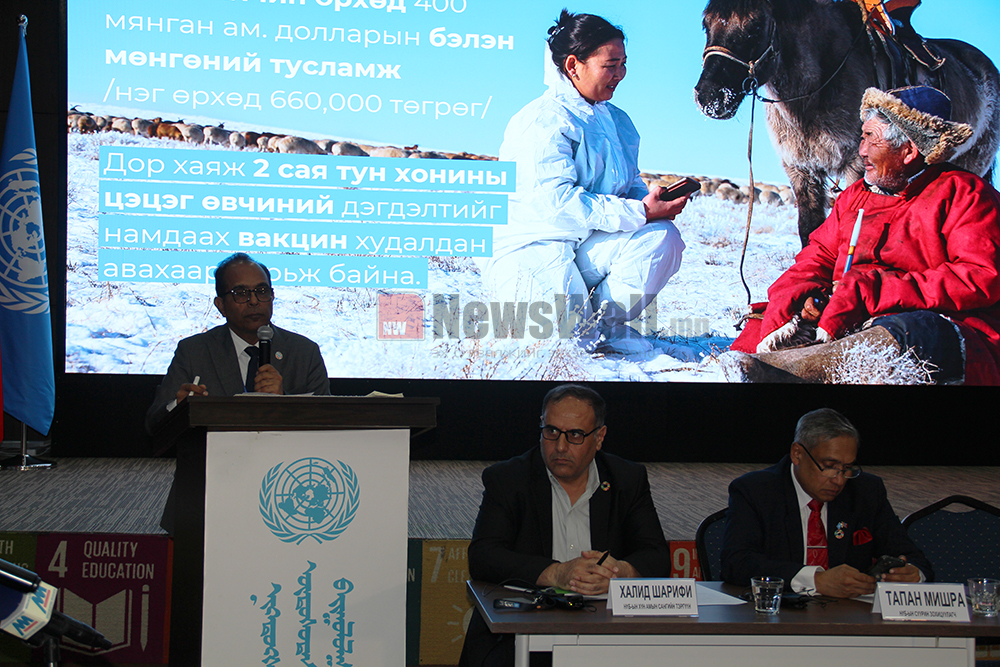 Монгол Улс дахь Хүмүүнлэгийн тусламжийн багаас зудтай тэмцэхэд дэмжлэг үзүүлэх талаар гаргасан уриалгын дагуу Монгол оронд тохиосон зудад нэрвэгдсэн малчдад өвөлжилт, хаваржилтын хүндрэлийг даван туулахад туслах зорилгоор НҮБ-ын Онцгой байдлын нэгдсэн сан (ОБНС)-гаас 1.55 сая ам.долларын санхүүжилт олгох нарийвчилсан төлөвлөгөөний талаар өнөөдөр сэтгүүлчдэд /2024.05.22/ мэдээллээ.