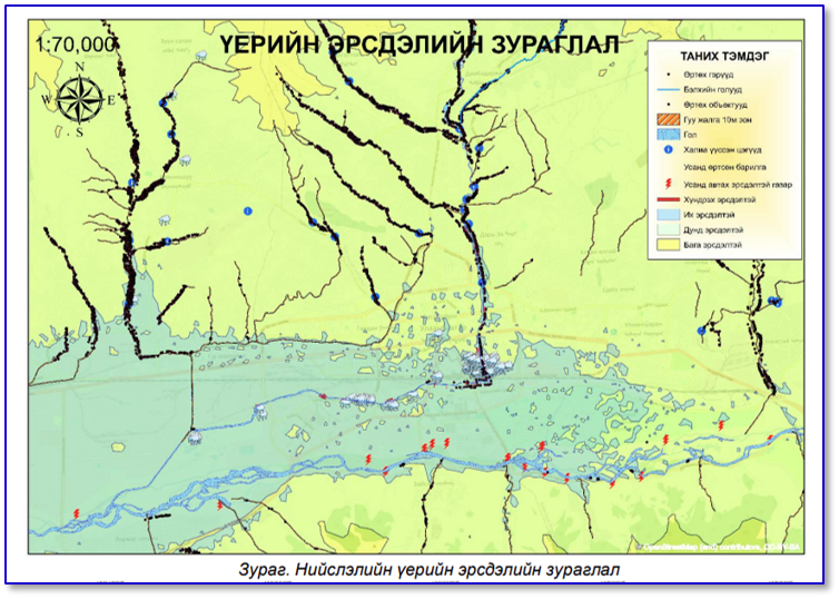 Үерийн эрсдэл өндөр Баянзүрх дүүргийн 10, 11, 23, 27, 29 дүгээр хороонд зөвшөөрөлгүй 212, Сүхбаатар дүүргийн 15,16,18, 20 дугаар хороонд 70, Чингэлтэй дүүргийн 24 дүгээр хороонд 24, Налайх дүүргийн 1, 6, 8 дүгээр хороонд 68, Баянгол дүүргийн 10,23 дугаар хороонд 3 айл өрх байна.