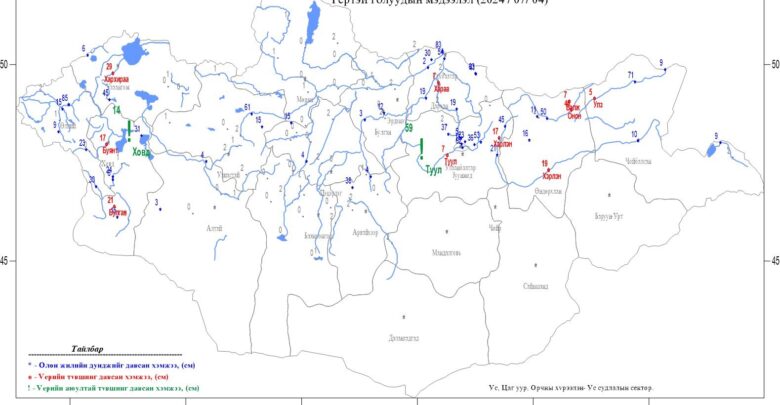 7 дугаар сарын 4-ний өдрийн байдлаар Хэнтийн нурууны баруун хажуугийн Туул /Алтанбулаг/, Алтай нуруунаас эхтэй Ховд, Буянт, Булган, Увс нуурын савын Хархираа зэрэг голуудын усны түвшин өмнөх өдрийнхөөс 5-40 см нэмэгдсэн байна. Өнөөдрийн байдлаар Туул /Улаанбаатар/, Хараа /Дархан/, Хэрлэн /Мөнгөнморьт-Өндөрхаан/, Балж, Онон, Улз зэрэг голууд үерийн түвшинг 5-45 см, Туул гол Лүн сум орчимд үерийн аюултай түвшинг 60 см давсан байдалтай байна. Хэрлэн голын дагуу үргэлжилж буй үер наадмын өдрүүдэд буюу 7 дугаар сарын 10, 11-ны үед Чойбалсан хот хүрч, үерийн түвшинг 10 см орчим давах магадлалтай байна.