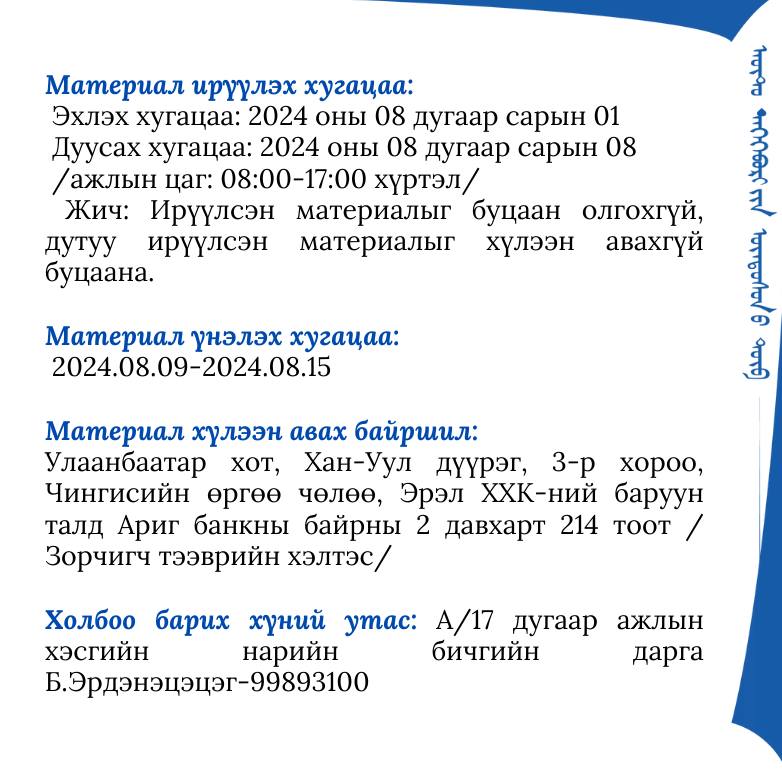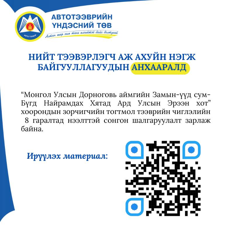 “Монгол Улсын Дорноговь аймгийн Замын-үүд сум-Бүгд Найрамдах Хятад Ард Улсын Эрээн хот” хоорондын зорчигчийн тогтмол тээврийн чиглэлийн 8 гаралтад нээлттэй сонгон шалгаруулалт зарлаж байна.