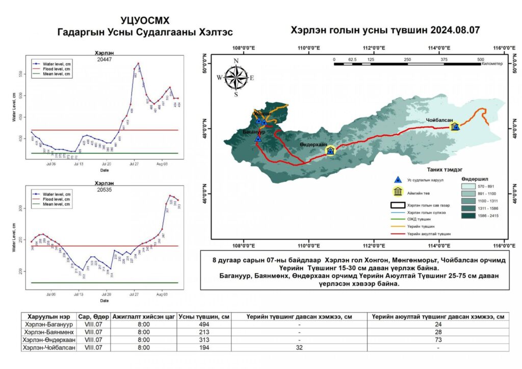 2024 оны 8 дугаар сарын 7-ны өдрийн 08 цагийн байдлаар Онон гол Дадал сум орчимд усны түвшин өмнөх өдрийнхөөс 60 см нэмэгдэж, үерийн аюултай түвшинг 195 см даван хүчтэй үерлэж байна.