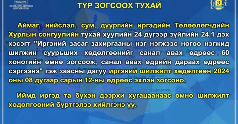 “Аймаг, нийслэл, сум, дүүргийн иргэдийн Төлөөлөгчдийн Хурлын 2024 оны ээлжит сонгуулийн үйл ажиллагааг зохион байгуулах цаг хугацааны хуваарь”-ийн дагуу иргэний шилжилт хөдөлгөөнийг 8 дугаар сарын 12-оос зогсоож, 10 дугаар сарын 12-оос сэргээнэ.
