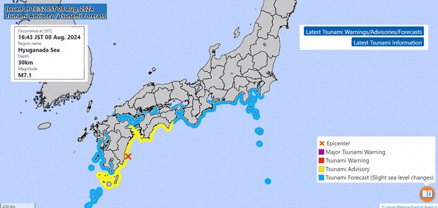 Япон Улсын Миязаки мужид 2024 оны 8 дугаар сарын 8-ны өдөр болсон газар хөдлөлтийн улмаас илүү өргөн хүрээг хамарсан хүчтэй газар хөдлөлт болох магадлал нэмэгдсэн тухай Япон Улсын Цаг уурын агентлагаас мэдээлж, иргэдэд сэрэмжлүүлэг гаргаад байгаа аж.
