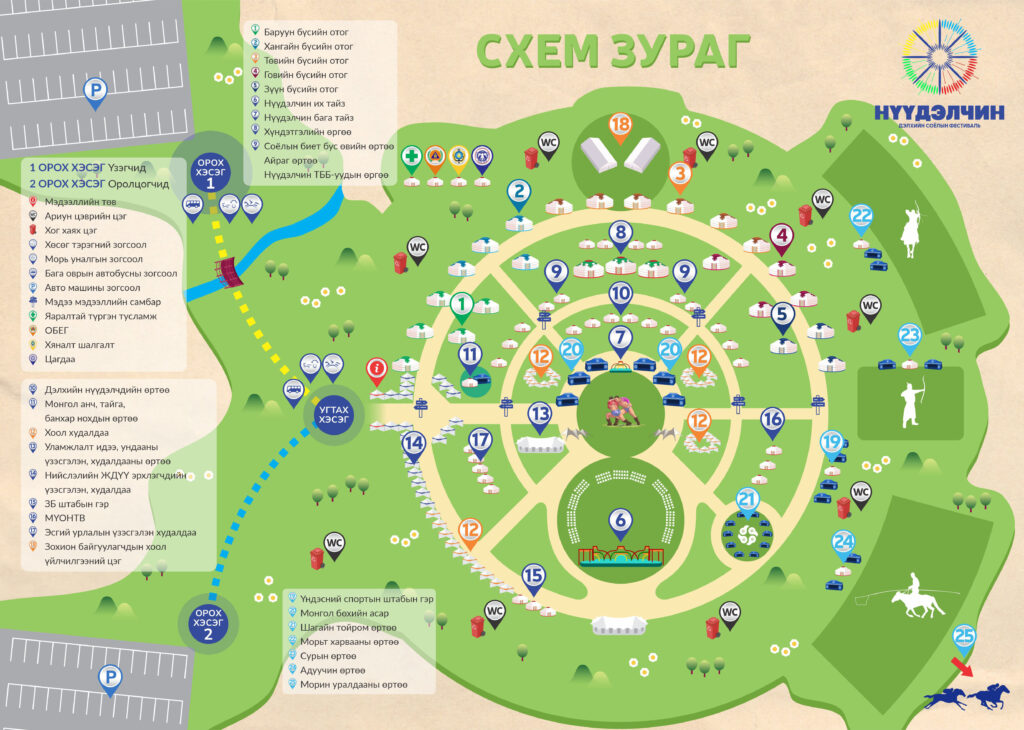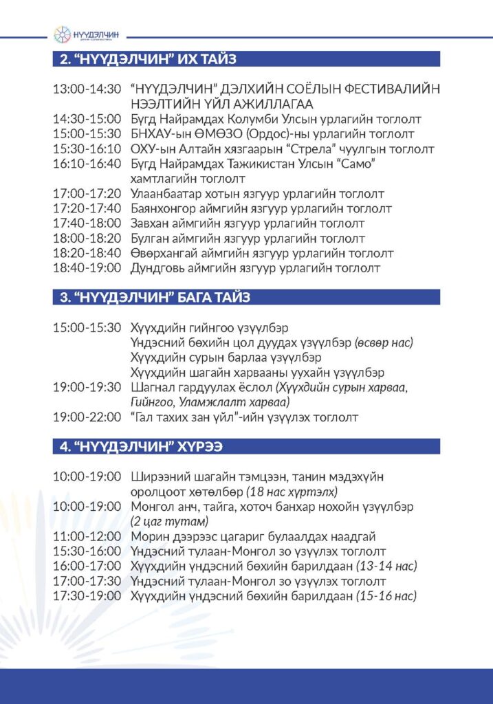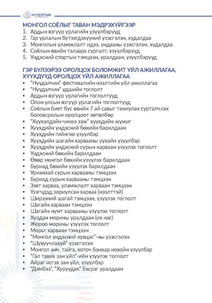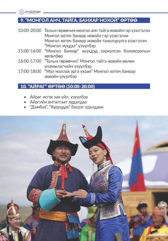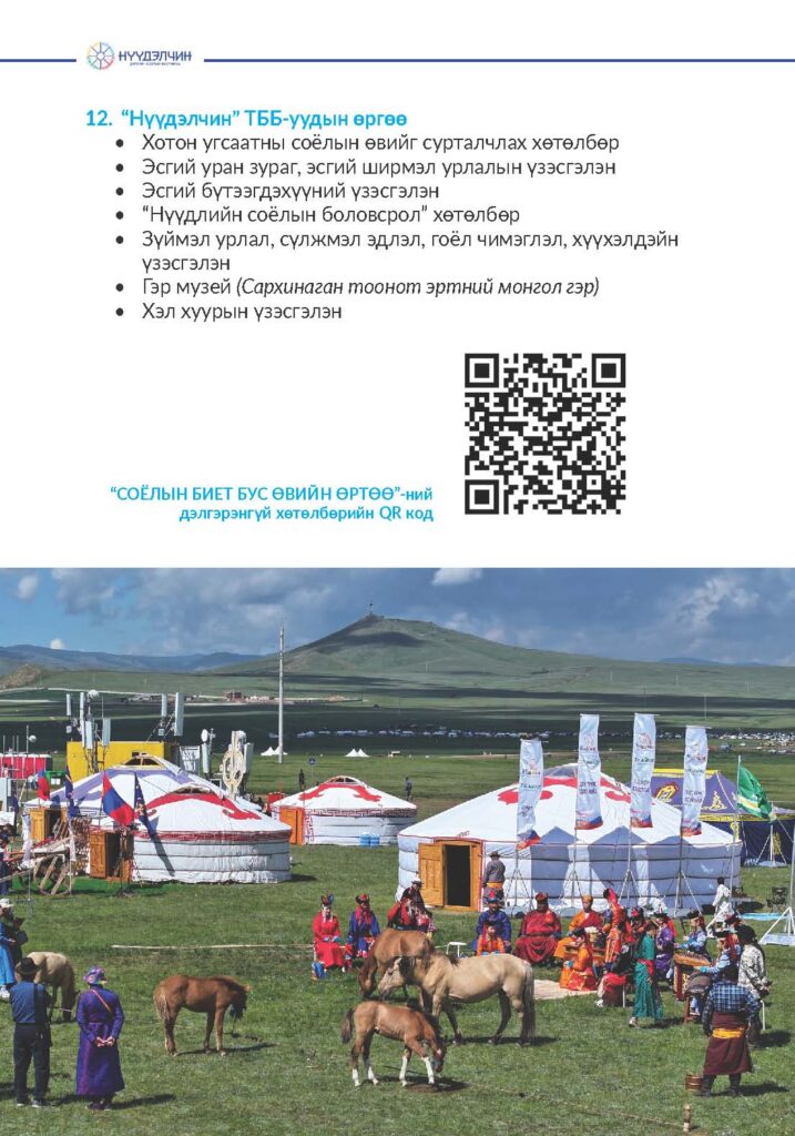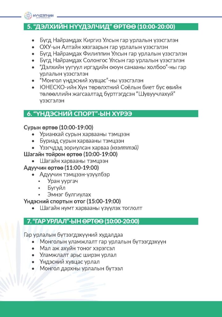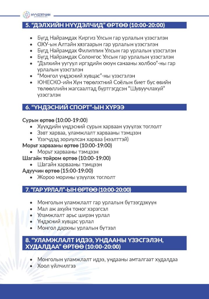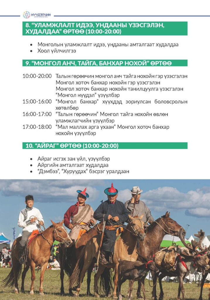 Фестивальд хүрэлцэн ирснээр отог, өртөө бүрээр зочлон өв соёлтойгоо танилцах, үзүүлэн тоглолт үзэж сонирхох, соёлын үйлдвэрлэлийн бараа бүтээгдэхүүн худалдан авах, хүүхэд багачууд гэр бүлд зориулсан соёлын боловсролын хөтөлбөрүүдэд хамрагдан, амтат хоолоор үйлчлүүлэх бүхий л үйлчилгээг нэг дор төвлөрүүлсэн.