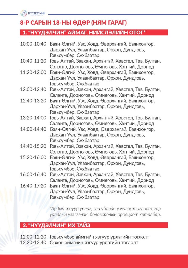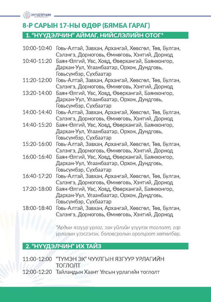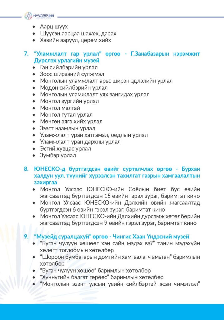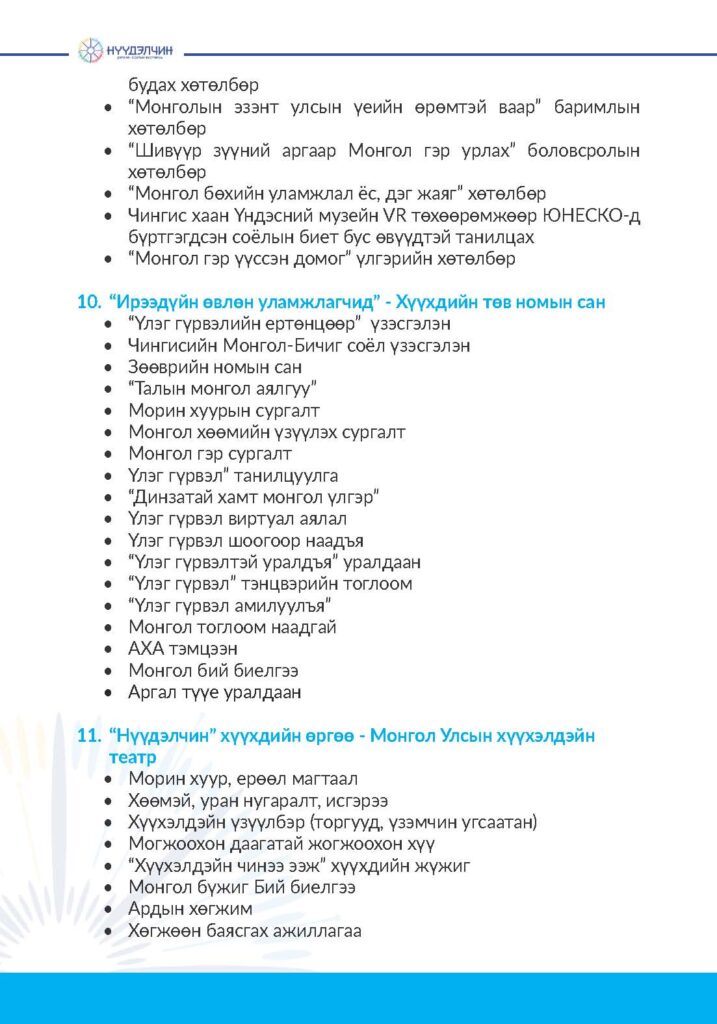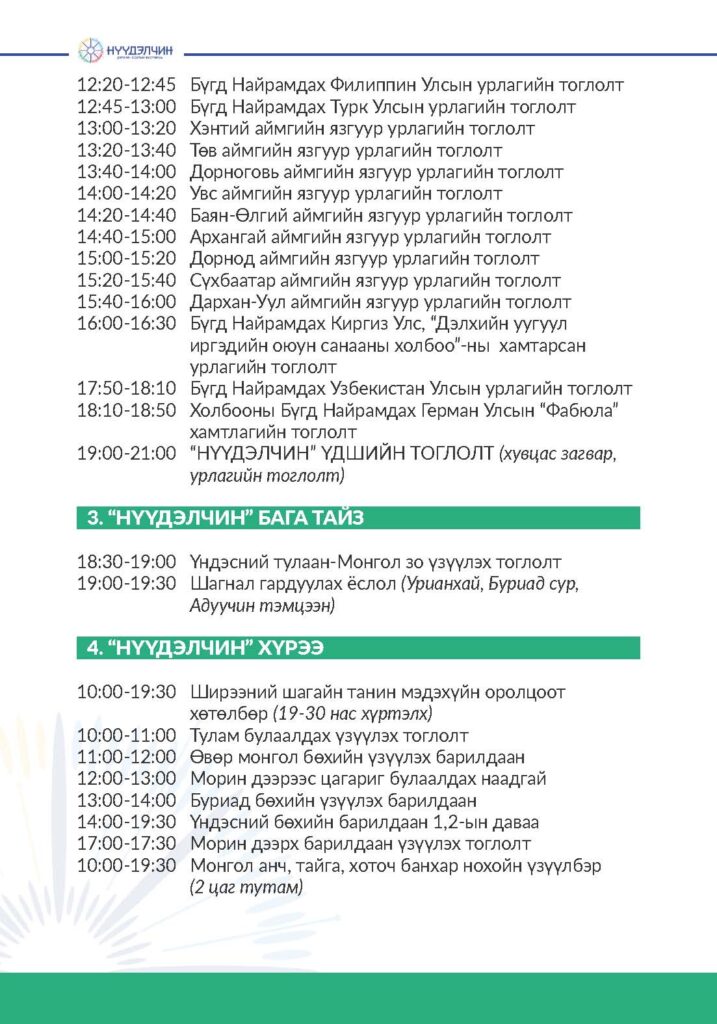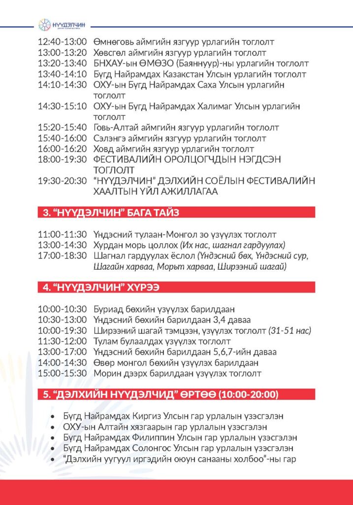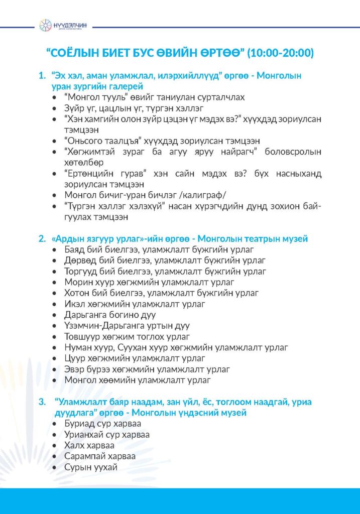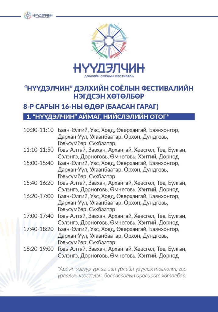 Фестивальд хүрэлцэн ирснээр отог, өртөө бүрээр зочлон өв соёлтойгоо танилцах, үзүүлэн тоглолт үзэж сонирхох, соёлын үйлдвэрлэлийн бараа бүтээгдэхүүн худалдан авах, хүүхэд багачууд гэр бүлд зориулсан соёлын боловсролын хөтөлбөрүүдэд хамрагдан, амтат хоолоор үйлчлүүлэх бүхий л үйлчилгээг нэг дор төвлөрүүлсэн.