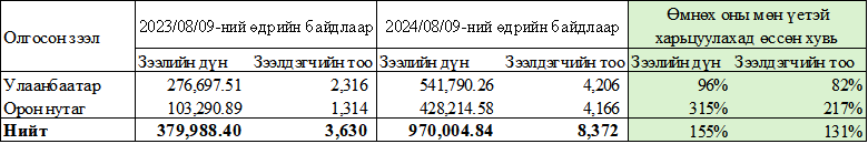 Орон сууцны ипотекийн хөтөлбөрийн хүрээнд оны эхнээс энэ сарын 09-ний өдрийн байдлаар 970 тэрбум төгрөгийн зээлийг 8 372 өрхөд олгожээ. Улаанбаатарт 542 тэрбум төгрөгийн зээлийг 4206 өрхөд, 428 тэрбум төгрөгийн зээлийг 4,166 өрхөд олгосон байна. Энэ нь өмнөх оны мөн үетэй харьцуулахад ойролцоогоор 155 хувиар өссөн үзүүлэлт бөгөөд үүнээс орон нутагт олгосон зээлийн дүн ойролцоогоор 315 хувь өссөн байна.