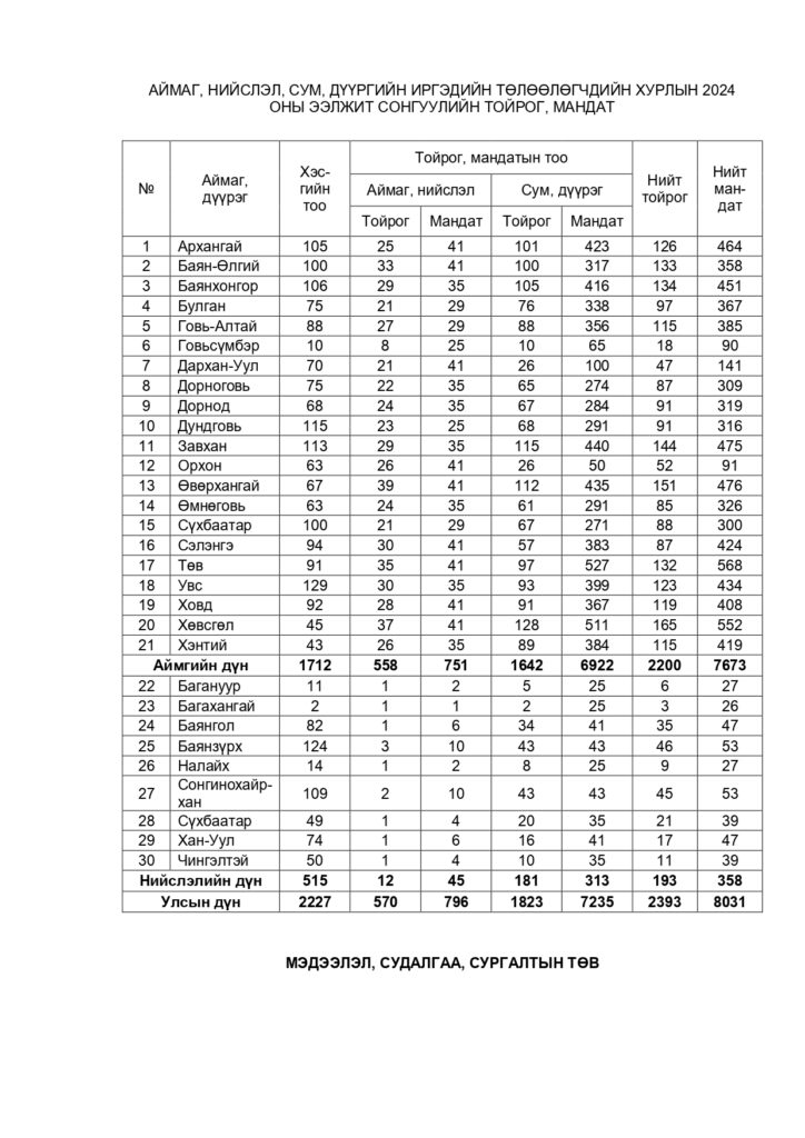 Аймаг, нийслэл, сум, дүүргийн иргэдийн Төлөөлөгчдийн Хурлын 2024 оны ээлжит сонгуулиар 2393 тойрог байгуулж, 8031 мандат тогтоосон. Тодруулбал, 21 аймгийн 558 тойрог 751, сумдын 1642 тойрог 6922, нийслэлийн 12 тойрог 45, дүүргийн 181 тойрог 313 мандаттай юм.