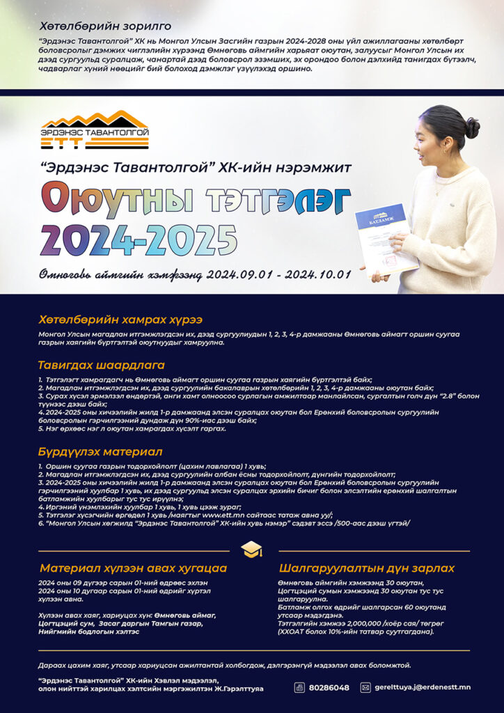 “Эрдэнэс Тавантолгой” ХК нь Монгол Улсын Засгийн газрын 2024-2028 оны үйл ажиллагааны хөтөлбөрт боловсролыг дэмжих чиглэлийн хүрээнд Өмнөговь аймгийн харьяат оюутан, залуусыг Монгол Улсын их дээд сургуульд суралцаж, чанартай дээд боловсрол эзэмших, эх орондоо болон дэлхийд танигдах бүтээлч, чадварлаг хүний нөөцийг бий болоход дэмжлэг үзүүлэхэд оршино.