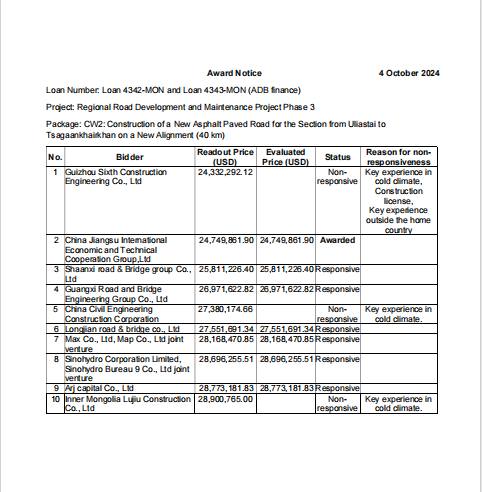 Азийн хөгжлийн банкны 2024 оны 09 дүгээр сарын 26-ны өдрийн гэрээ байгуулах зөвшөөрлийг үндэслэн “China Jiangsu International Economic and Technical Cooperation Group, LTD”-тай гэрээ байгуулах мэдэгдлийг Төрийн нарийн бичгийн даргын 03/62 албан тоотоор мэдэгдэж, ажил гүйцэтгэх гэрээ байгуулах бэлтгэл ажил хангагдаж байна.