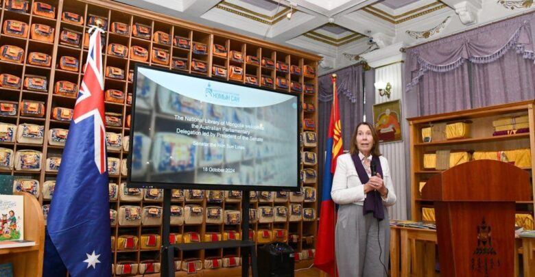 Монгол Улсын Их Хурлын дарга Дашзэгвийн Амарбаясгалангийн урилгаар Австралийн Холбооны Улсын Парламентын Сенатын танхимын Ерөнхийлөгч Сюзан Лаянс тэргүүтэй Сенатын гишүүд 2024 оны 10 дугаар сарын 16-19-нд Монгол Улсад албан ёсоор айлчилж байна. Зочид төлөөлөгчид өнөөдөр /2024.10.18/ Монгол Улсын Үндэсний номын сангийн Үнэт ховор номын музейд зочилж, Монголын оюуны өв, хосгүй ховор бүтээлүүдтэй танилцлаа.