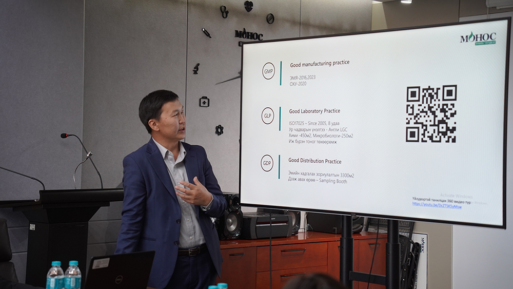 Үйлдвэрийн үйл ажиллагаатай танилцахаар ирсэн сэтгүүлчдэдээ баярлалаа. Монос үеийн үед иргэд, олон нийтэд нээлттэй компани байж ирсэн. Бид дотоодын хэрэглэгчийн эмийн хэрэглээг хангах гэхээсээ илүүтэйгээр үйлдвэрлэж буй бүтээгдэхүүнийхээ чанар, аюулгүй байдал хийгээд шинээр хөгжүүлж буй судалгааны бүтээгдэхүүн дээрээ илүүтэй анхаарч ажиллаж байна. Бидний ойрын төлөвлөгөө бол экспортод гаргаж буй бүтээгдэхүүнүүд дээрээ анхаарч байгаа бөгөөд одоогоор Киргиз улсад нээсэн төлөөлөгчийн газраа жигдрүүлэхээр ажиллаж байна. Киргиз улсад Моносын хүнс, гоо сайхны бүтээгдэхүүнүүд нийлэгдэж 3 ч удаагийн ачилт хийгдээд явж байна. Энэ нь тухайн улсын ойролцоо 4,5 улсад Моносын бүтээгдэхүүн худалдаалагдах боломж бүрдэж байгаа хэрэг юм. Өнөөдөр Монгол улсад 20 орчим эмийн үйлдвэрүүд эм ханган нийлүүлж байна. Бид чөлөөт өрсөлдөөний зарчмаараа үнээ тогтоож байна.
