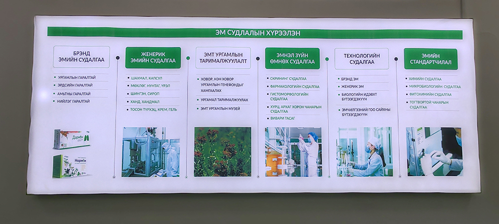 Үйлдвэрийн тухайд өөрийн лабораторидоо химийн 327, микробиологийн 40 үзүүлэлтээр жилдээ 4000 орчим дээжид шинжилгээ хийдэг. Хүчин чадлын хувь ажлын 8 цагаар 1 сард 500,000 блистер эм, 200,000 пакет мөхлөг эм, 100,000 флакон ургамлын гаралтай эм, 150,000 флакон шингэн эм, 200,000флакон ариутгал, халдваргүйжүүлэлтийн бүтээгдэхүүн, 1,000,000 уутан үрлийг үйлдвэрлэж хүчин чадалтай үйл ажиллагаагаа явуулж байна. Бид Англи улсын LGP стандарт ур чадварын шалгалтад 8 удаа хамрагдаж амжилттай даваад байна.