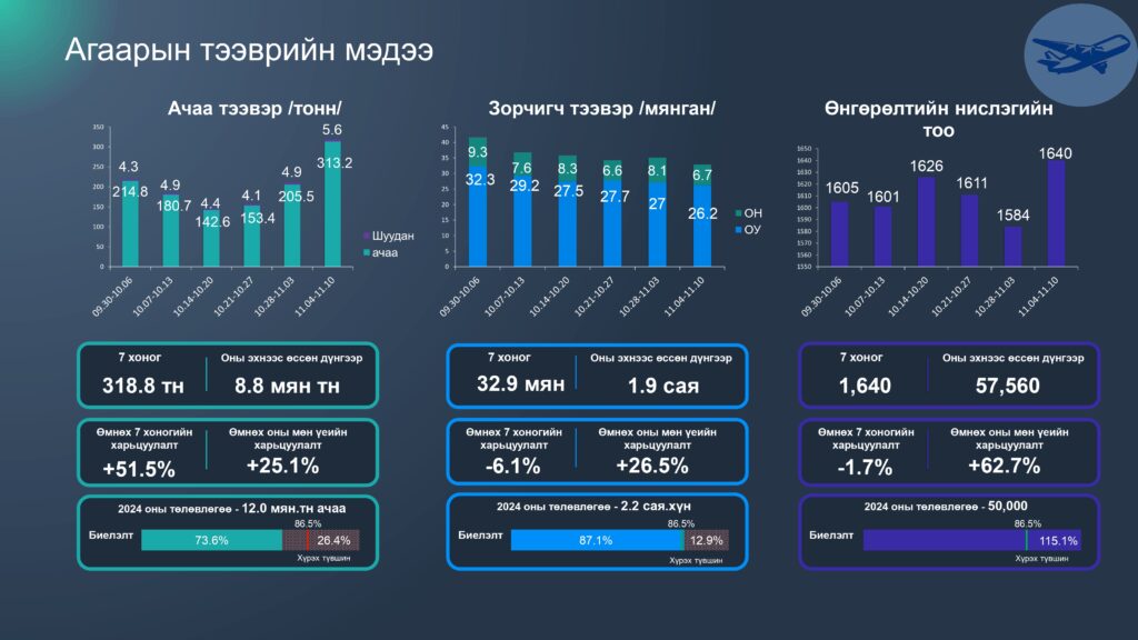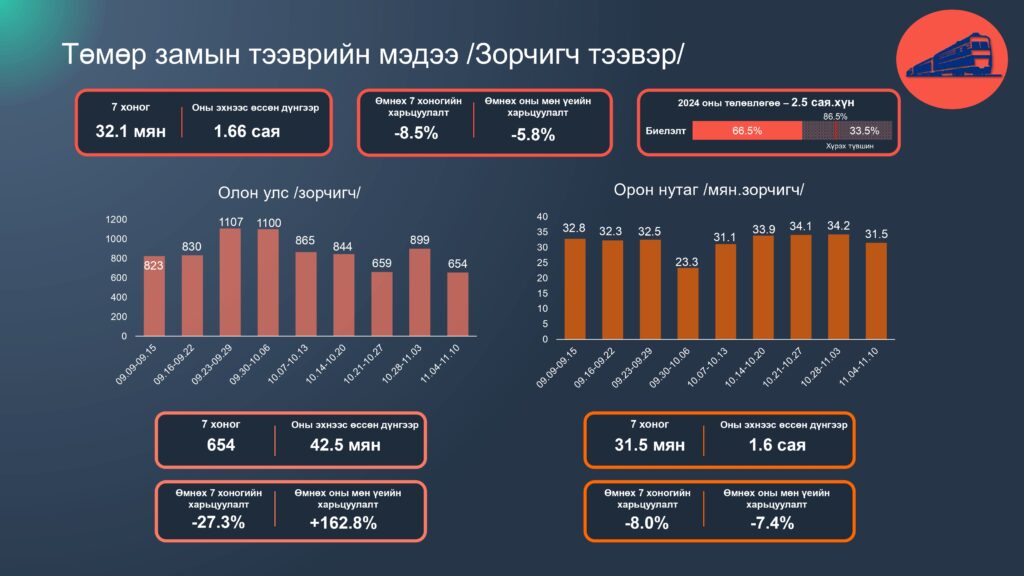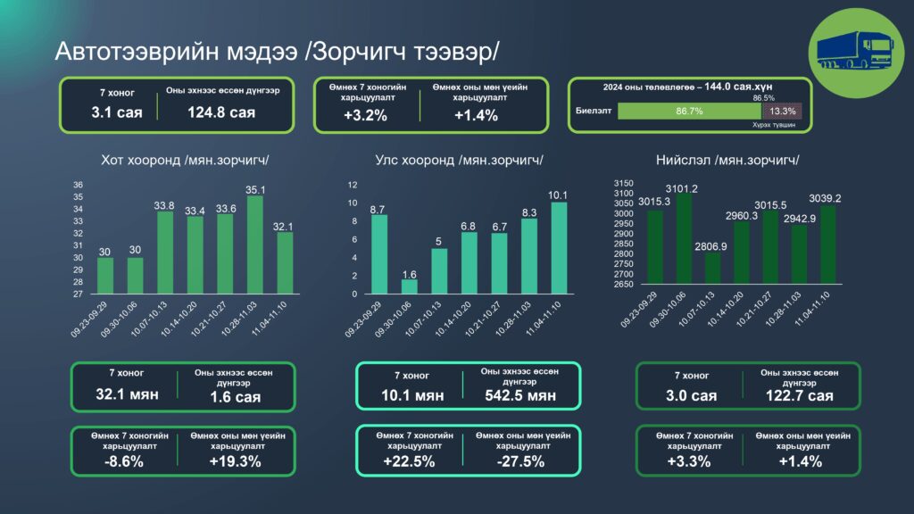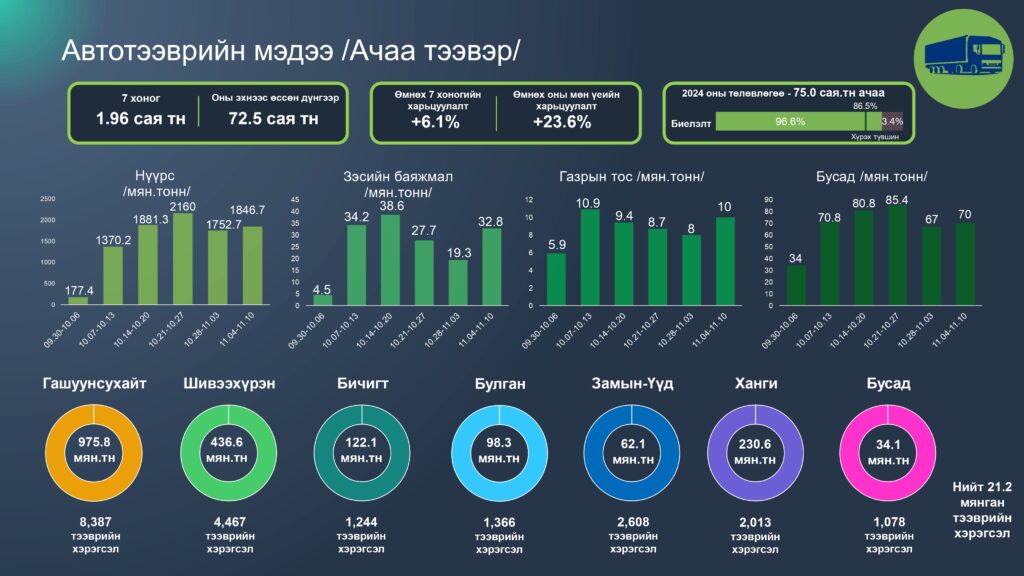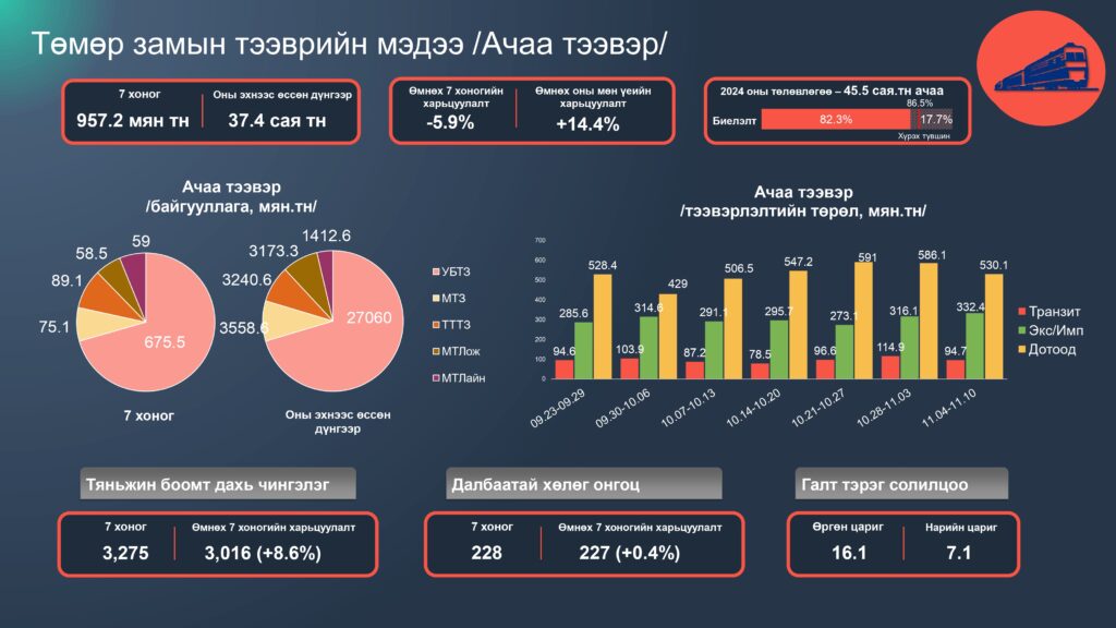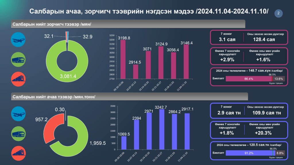 Зам тээврийн салбарын 2024 оны 11 дүгээр сарын 04-10 хүртэлх 7 хоногийн статистик мэдээллийг хүргэж байна. Энэ оны 11 сарын 10-ны байдлаар салбарын нийт ачаа тээвэр 109.9 сая тонн болж өмнөх оны мөн үетэй харьцуулахад 20.3 хувиар өссөн бөгөөд 2024 оны төлөвлөгөөний биелэлт 91.2 хүрчээ.