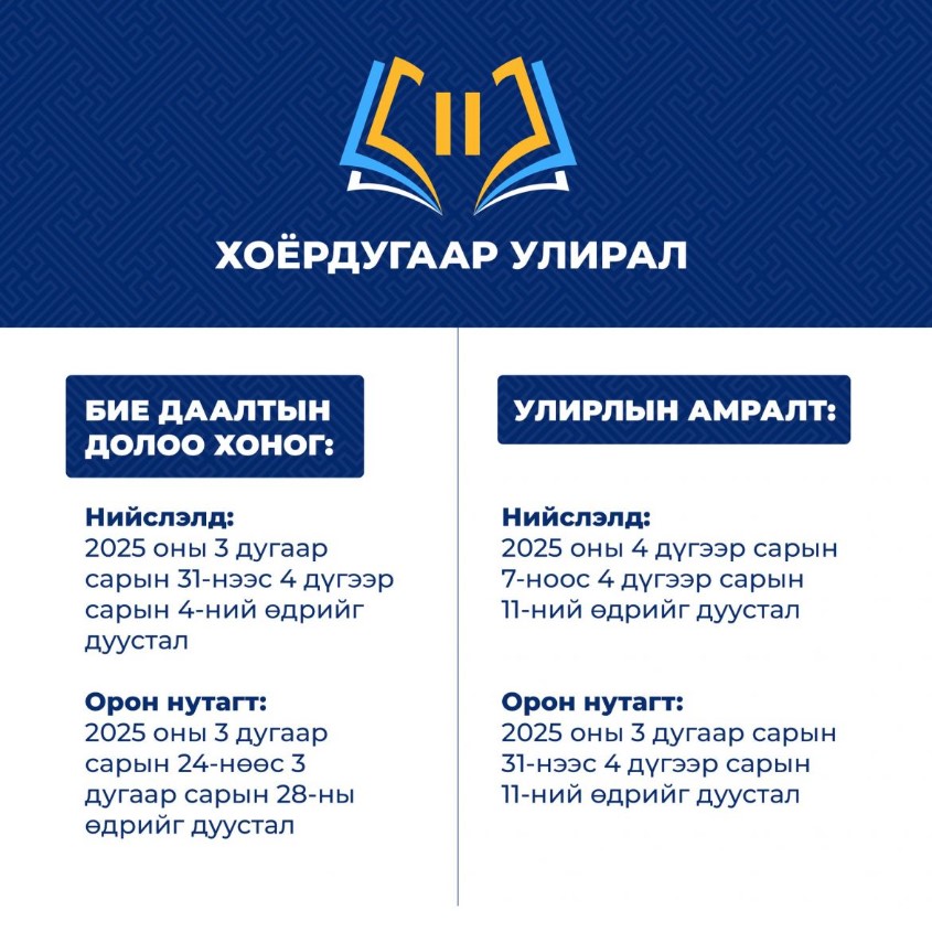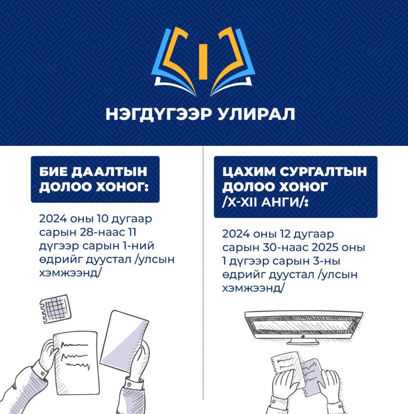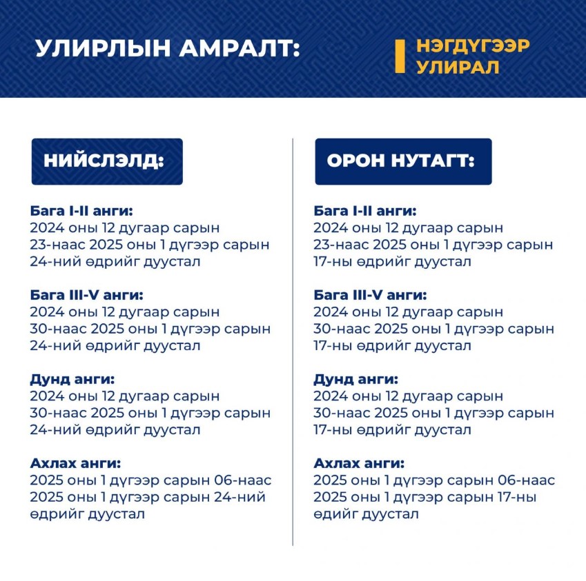 - Орон нутагт I-II ангийнхан 12-р сарын 23-наас 1-р сарын 17-ныг дуустал