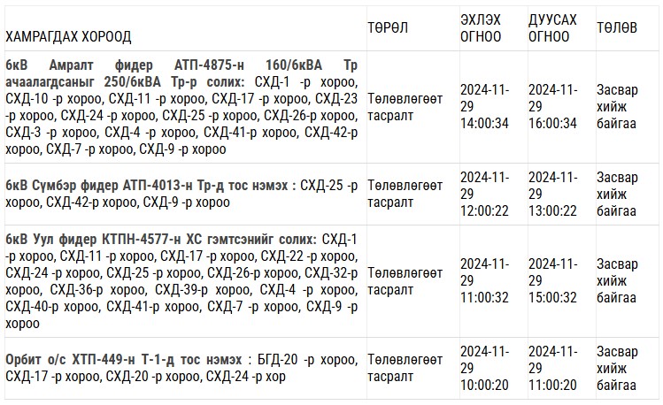 Өнөөдөр цахилгаан түр хязгаарлах хуваарь
