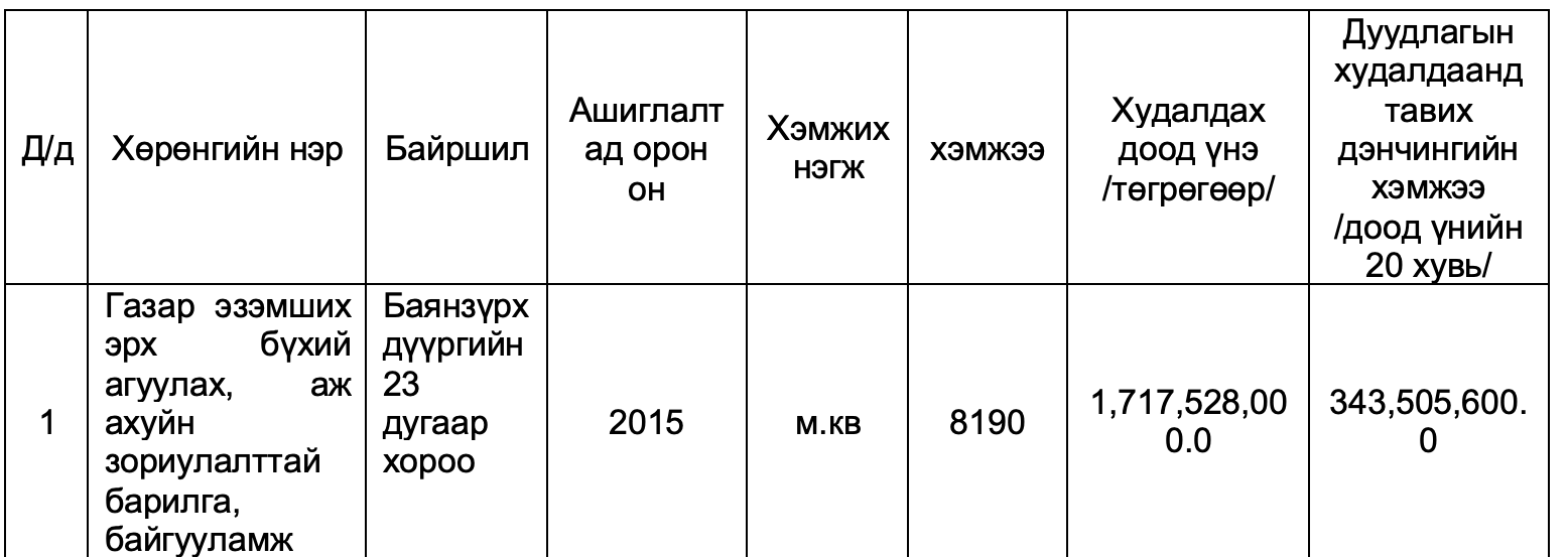 Дуудлага худалдаа 2025 оны 02 дугаар сарын 05-ны өдрийн 11 цагт Төрийн өмчийн бодлого, зохицуулалтын газрын хурлын танхимд болно.