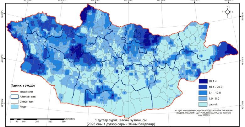 Цаг уурын байгууллагаас арав хоногт нэг удаа хийдэг хээрийн цасны хэмжилтийн мэдээгээр нэгдүгээр сарын 10-ны байдлаар нийт нутгийн 60 гаруй хувьд цастай байгаагаас Алтай, Хангай, Хэнтэй, Хөвсгөлийн уулархаг нутаг, Тамсагийн хоолойгоор 11-23 см, говь, тал хээрийн зарим сумдын нутгаар 1-10 см хүртэл зузаан цастай байна.