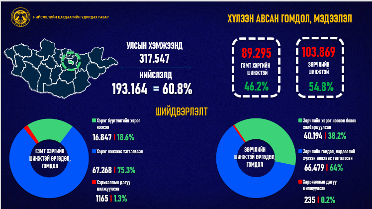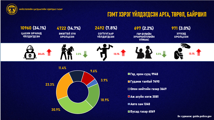 Тодруулбал, өнгөрсөн онд нийслэлийн хэмжээнд гэмт хэргийн шинжтэй нийт 193 мянга гаруй санал, гомдол мэдээлэл бүртгэгджээ. Үүний 54.8 хувь нь зөрчлийн шинжтэй байсан бол үлдсэн 46.2 хувь нь гэмт хэргийн шинжтэй гомдол, мэдээлэл байна. Нийслэлд бүртгэгдэж буй гэмт хэргийг арга, хэлбэрээр нь ангилбал цахим орчинд үйлдэгдсэн 10960, эмэгтэй хүн оролцсон 4722, согтуугаар үйлдэгдсэн 2492, гэр бүлийн хүчирхийллийн улмаас 697, хүүхэд оролцсон 971 хэрэг бүртгэгдсэн байна.