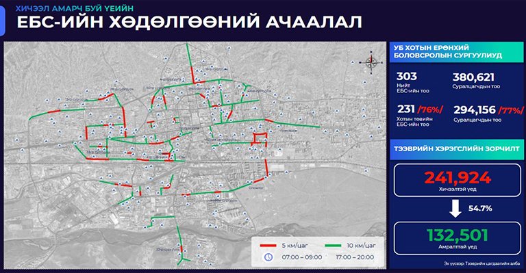 Нийслэлийн хэмжээнд ЕБ-ын 303 сургуульд 380.621 сурагч суралцаж байна. Нийт сургуулийн 76 хувь нь буюу 231 сургууль хотын төвд байрладаг бөгөөд тэдгээр сургуульд 294.156 сурагч суралцаж байгаа юм. Замын хөдөлгөөний удирдлагын төвийн датанд тулгуурлан судлаачдын тооцоолсноор ЕБС-иудын ойр орчимд замын хөдөлгөөний ачаалал эрс нэмэгддэг. Хичээлтэй үед өдөрт 241.924 тээврийн хэрэгсэл хөдөлгөөнд оролцдог бол амралттай үед 132.501 болтлоо 54.7 хувиар хөдөлгөөний ачаалал буурдаг байна.