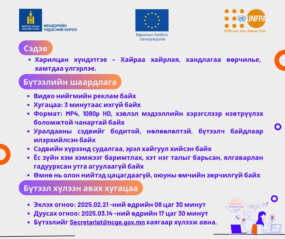 Жендэрийн үндэсний хорооноос жил бүр зохион байгуулдаг “Харилцан хүндэтгэе” аяны хүрээнд сэтгүүлчид, контент бүтээгчид, болон сэтгүүл зүйн чиглэлээр суралцаж буй оюутнуудад зориулсан нийгмийн рекламын уралдаан зарлаж байна.
