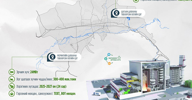 Улаанбаатар хот төдийгүй Монгол Улсад анх удаа хог шатааж эрчим хүч үйлдвэрлэх үйлдвэрийг төр, хувийн хэвшлийн түншлэлээр барих саналыг өнөөдөр 16:00 цагт нээнэ. Тус үйлдвэрийг Морингийн даваа болон Цагаан давааны төвлөрсөн хогийн цэгийг түшиглэн барих бөгөөд хог хаягдлын менежментийг сайжруулж, эдийн засгийн эргэлтэд оруулах, хөрс, орчны бохирдлоос сэргийлж, хүлэмжийн хийг бууруулахад чухал ач холбогдолтой. Жилд 300-400 мянган тонн хог шатааж, 24 МВт эрчим хүч үйлдвэрлэх хүчин чадалтай байна.