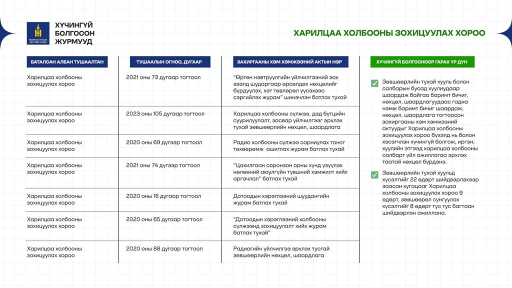 - 17 журам – Харилцаа холбоо, эрчим хүчний зохицуулалтын хүрээнд