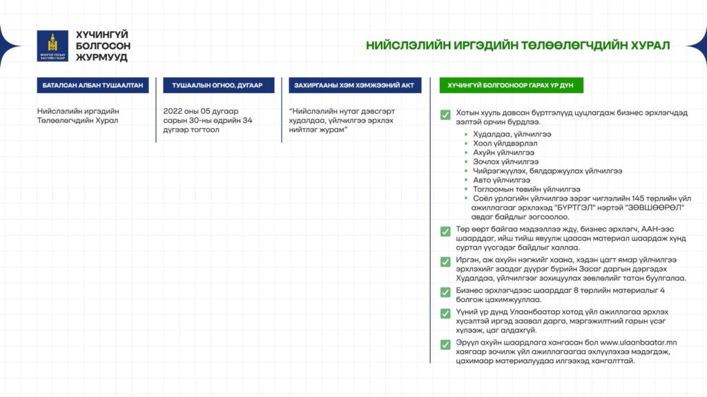 Монгол Улсад бизнес эрхлэх, бүтээн байгуулах иргэн, аж ахуйн нэгжүүд тусгай зөвшөөрөл авахын тулд шат дамжлага, шаардлагагүй бичиг цаас, төрийн хаалга сахих явдалтай олон жил тулгарч ирлээ. Энэ бүхнийг цэгцлэхээр “Бизнест ээлтэй Монгол” санаачилгын хүрээнд хууль давсан 50 журмыг цуцаллаа. Тухайлбал:
