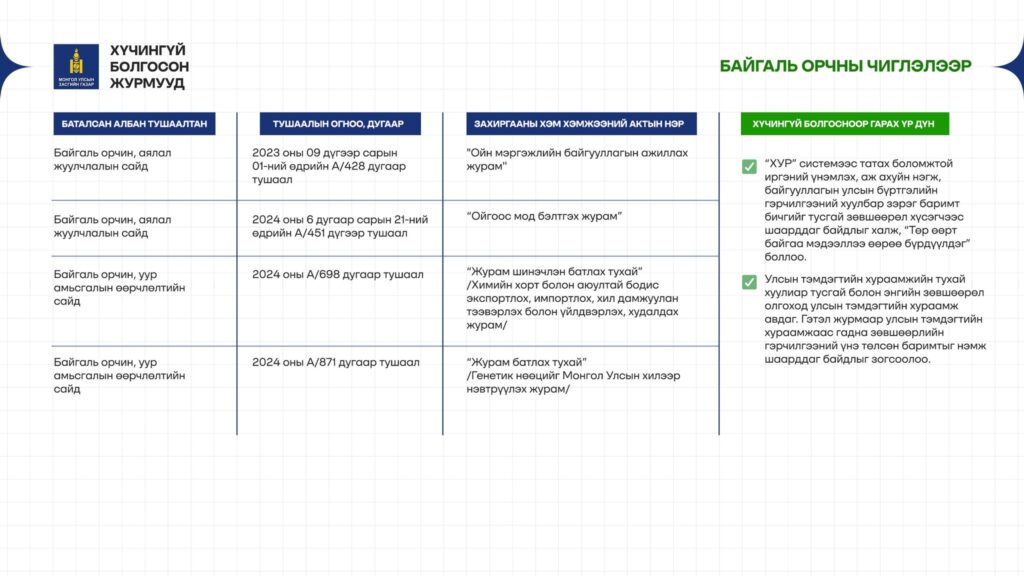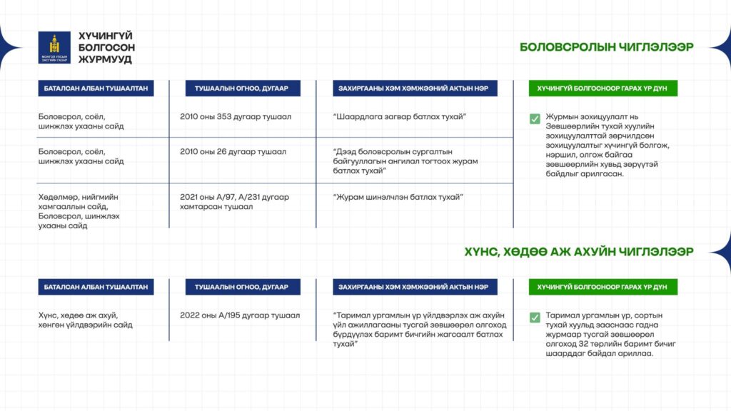 - 28 журам – Эрүүл мэнд, боловсрол, барилга, байгаль орчин, хүнс, санхүү зэрэг салбаруудад
