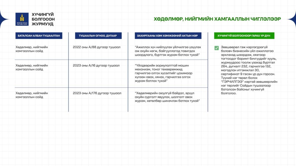 - Хүнд суртлын олон шат дамжлагыг халж, зөвшөөрлийг цахимаар олгох нөхцөл бүрдэв.
