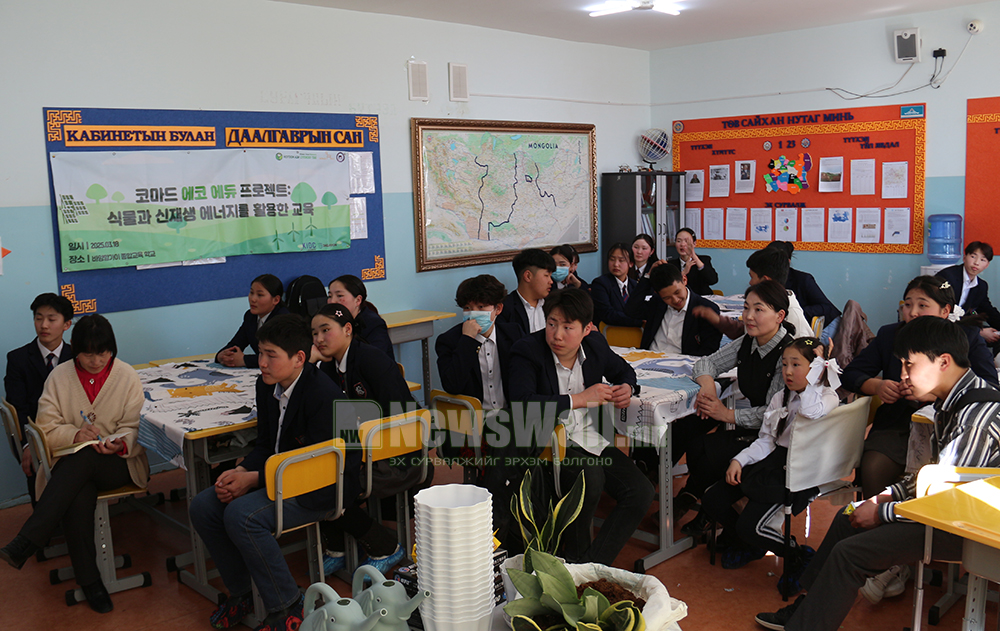 БНСУ-ын КОЙКА Олон улсын хамтын ажиллагааны байгууллагын санхүүжилттэй Eco-Edu төслийн хүрээнд зохион байгуулагдсан уг сургалтаар дотоод орчны агаарын бохирдлыг бууруулах зорилгоор тасалгааны ургамал тарих арга барил, нөхөн сэргээгдэх эрчим хүчийг хэрхэн дахин ашиглаж болох талаар мэдээлэл өгөв.