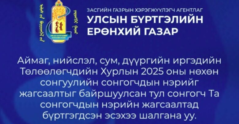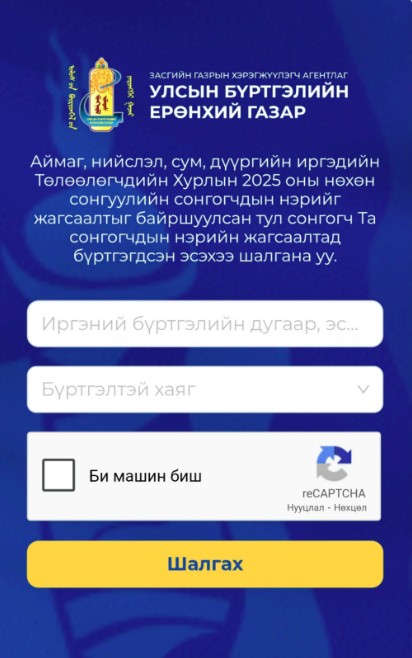 Сонгогч та ЭНД ДАРЖ сонгогчдын нэрийн жагсаалт дахь өөрийн мэдээллээ шалгана уу. Тодруулбал, Улсын бүртгэлийн ерөнхий газрын https://burtgel.gov.mn/ цахим хуудсанд хандаж, “Аймаг, нийслэл, сум, дүүргийн иргэдийн Төлөөлөгчдийн Хурлын 2025 оны нөхөн сонгуулийн сонгогчдын нэрийн жагсаалт” цонхыг идэвхжүүлэн иргэний бүртгэлийн дугаар /РД дугаар/, бүртгэлтэй хаягийн мэдээллээ оруулан шалгах боломжтой.