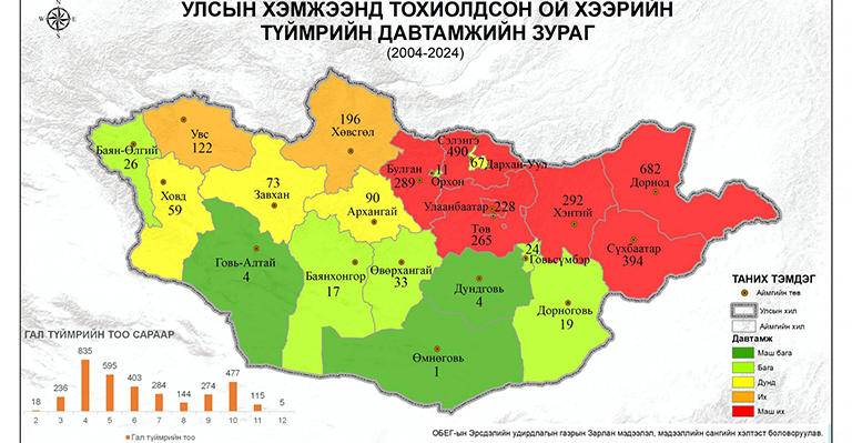 Улсын хэмжээнд сүүлийн 2004-2024 онуудад тохиолдсон ой, хээрийн гал түймрийн 24.7 хувь нь 4 сард, 54.2 хувь нь 4-6 саруудад тохиолдсон байна.