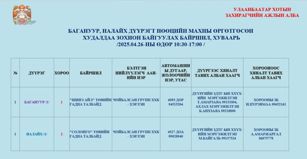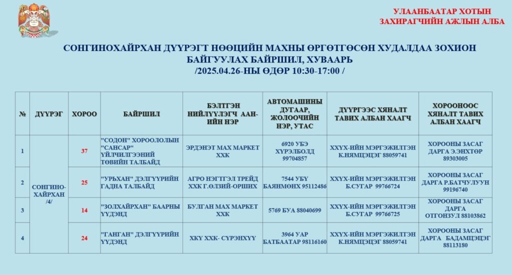 Маргааш буюу дөрөвдүгээр сарын 26-ны өдөр нийслэлийн есөн дүүргийн 23 байршилд нөөцийн махны өргөтгөсөн худалдааг 10:30-17:00 цагт зохион байгуулна. Хонины махыг гулуузаар, 1 кг нь 11800 төгрөгөөр худалдан борлуулна.
