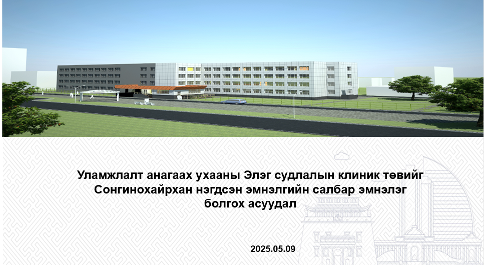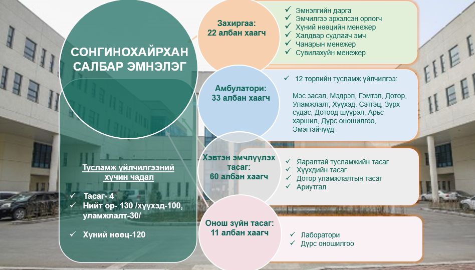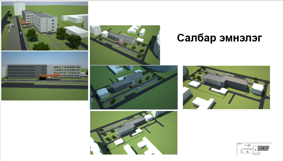 Салбар эмнэлгийн барилгын гадна талын хэмжилтийг хийж дээвэр болон гадна фасадын зураг хийгджээ. Дотор сантехник, цахилгаан болон агааржуулалт, дотор өрөөнүүдийн байршлын зураг төслийг Сонгинохайрхан эрүүл мэндийн төвийн байрны А блокын ерөнхий барилгын зургаар гүйцэтгэл хийгдэж байгаа аж.