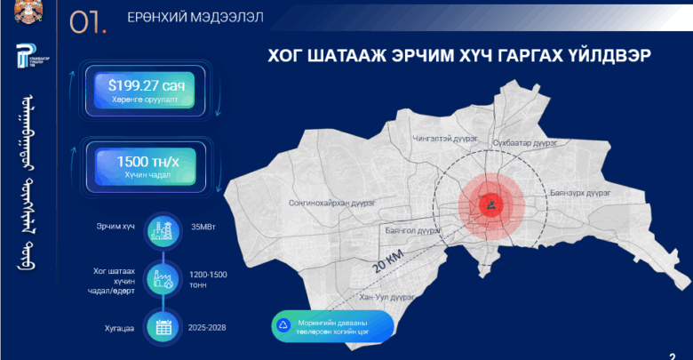 Нийслэлийн ИТХ-ын ээлжит бус VI хуралдаанаар “Хог шатааж эрчим хүч гаргах үйлдвэр” төслийг төр, хувийн хэвшлийн түншлэлээр хэрэгжүүлэх эрх олгох тухай асуудлыг хэлэлцэж, төлөөлөгчдийн олонхын саналаар /2025.05.26/ дэмжлээ. Төслийг Нийслэлийн Засаг даргын нэгдүгээр орлогч Т.Даваадалай танилцуулав. “Хог шатааж эрчим хүч гаргах үйлдвэр”-ийг Морингийн давааны төвлөрсөн хогийн цэгт барихаар төлөвлөсөн бөгөөд өдөрт 1200-1500 тонн хог шатааж эрчим хүч үйлдвэрлэх боломжтой байна.