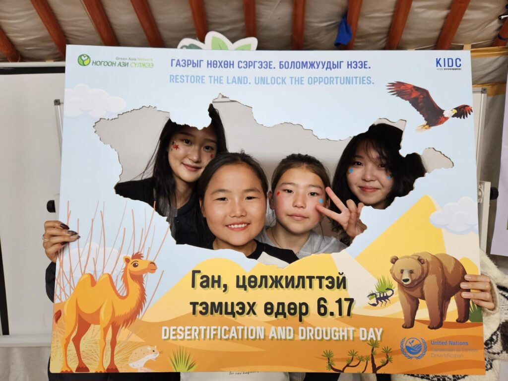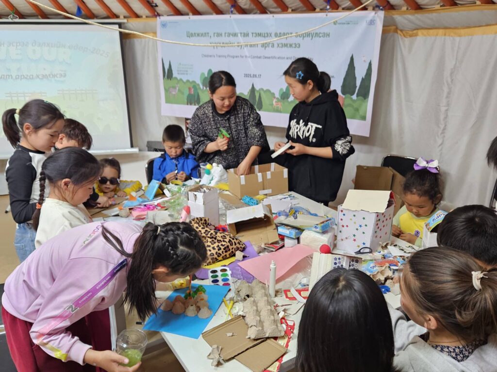 “Ногоон Ази сүлжээ” ТББ-аас энэ өдрийг тохиолдуулан байгаль орчны боловсролыг хүүхэд, өсвөр үеийнхэнд түгээн дэлгэрүүлэх, байгаль орчноо хамгаалах хандлагыг төлөвшүүлэх зорилгоор орон нутаг дахь ойжуулалтын талбайн ажилчдын хүүхдүүдийн дунд байгаль орчны сургалт зохион байгуулж, “Цөлжилт, ган гачиг хүүхдийн нүдээр-2025” гар зургийн уралдаан зохиожээ. Мөн “Хог хаягдалгүй эх дэлхий” уриан дор хаягдал материалаар бүтээл урлах уралдааныг хамтатган зохион байгуулсан байна.