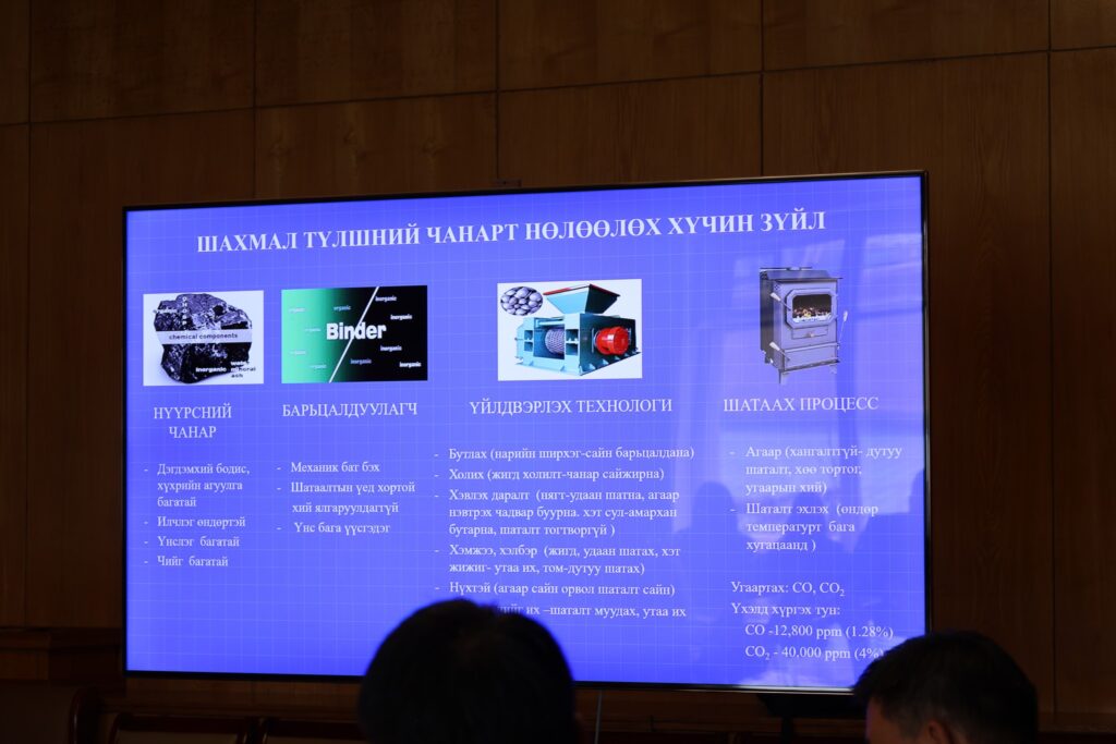 Мөн хуралдаанд ШУА-ийн Хими, химийн технологийн хүрээлэнгийн захирал, профессор Л.Жаргалсайхан Эрдэнэс Тавантолгой ХК-ийн тэг давхаргын баяжмал, түүнд тохирсон барьцалдуулагч бодисыг сонгох туршилт, судалгааны ажлын үр дүнг танилцуулав. Судалгааны дүгнэлтэд нүүрсэн шахмал түлшинд хамгийн тохиромжтой түүхий эд нь хагас кокс бөгөөд хагас коксоор шахмал түлш хийснээр хүхрийн болон нарийн ширхэгт тоосонцрын РМ2.5, РМ10 хэмжээг багадаа 50 хүртэл хувиар бууруулах боломжтойг дурдаж, тэг давхаргын баяжмалыг шахмал түлшний түүхий эд болгон шууд ашиглахгүй байхыг зөвлөлөө.