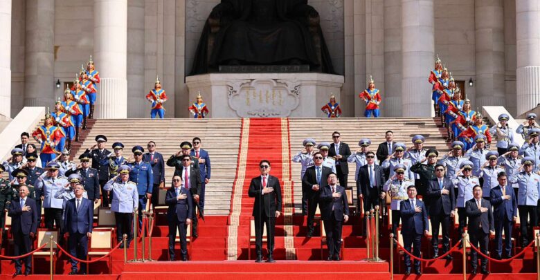 Төрийн далбааг мандуулах үед хөгжимд Төрийн дуулал эгшиглэж, 21 удаа ёслолын буудлага үйлдэн хүндэтгэл үзүүллээ.