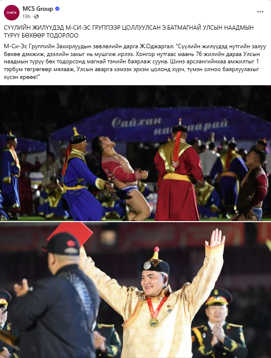 MCS группийн Захирлуудын зөвлөлийн дарга Ж.Оджаргал улсын арслан цол хүртсэн Баянхонгор аймгийн Жинст сумын харьяат бөх Э.Батмагнайн цолыг нэг тэрбум төгрөгөөр мялаана гэдгээ мэдэгджээ.
