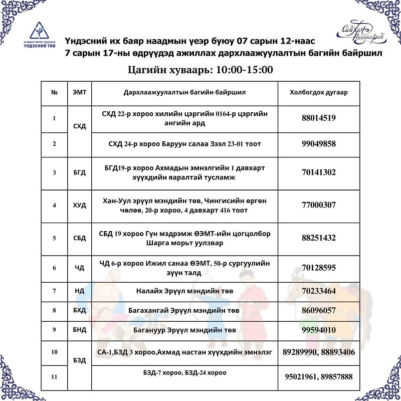 Үндэсний их баяр наадмаар улаанбурхан өвчний тархалт нэмэгдэх магадлалтайг мэргэжлийн байгууллагууд анхааруулсаар байна. Үүнтэй холбоотойгоор наадмын өдрүүдэд ч уг өвчний дархлаажуулалтыг өрнүүлж байгаа юм. Долдугаар сарын 12-17-ны өдрүүдэд 10:00-15:00 цаг хүртэл Улаанбурхан өвчний эсрэг вакцин хийх байршлуудыг танилцуулъя.