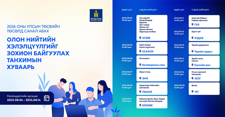 2026 оны төсвийн төсөлд олон нийтээс санал авах танхимын хэлэлцүүлгийн хуваарь гарлаа