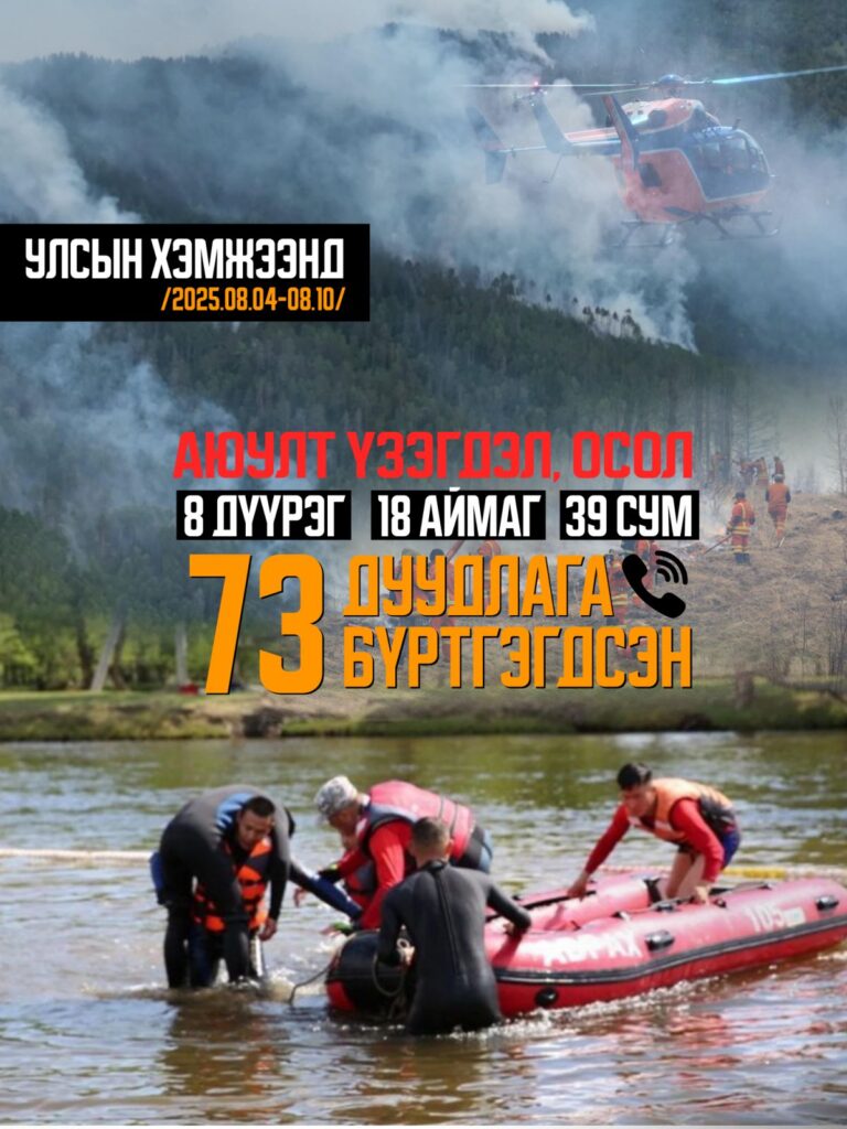 Улсын хэмжээнд өнгөрсөн долоо хоногт /2025.08.04-08.10/ нийслэлийн 8 дүүрэг, 18 аймгийн 39 суманд аюулт үзэгдэл, ослын 73 удаагийн дуудлага бүртгэгдсэн байна.