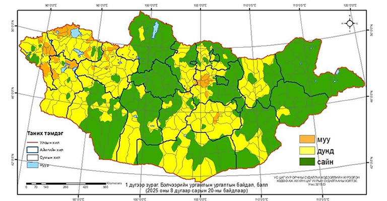 Ус цаг уур, орчны судалгаа мэдээллийн хүрээлэнгээс гаргасан бэлчээрийн ургамлын ургалтын байдал наймдугаар сарын 20-ны байдлаар нийт нутгийн 46 хувьд гантай болон гандуу, 54 хувьд хэвийн байна.