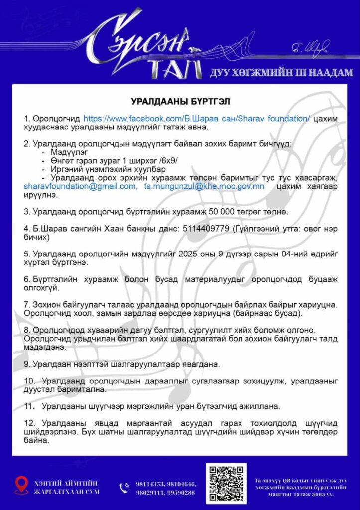 “Сэрсэн тал” дуу хөгжмийн III наадмын бүртгэл эхэллээ