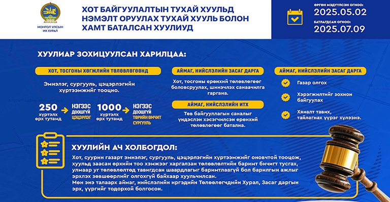 Монгол Улсын Их Хурлын 2025 оны хаврын ээлжит чуулганы хуралдаанаар Хот байгуулалтын тухай хуульд нэмэлт оруулах тухай хууль болон хамт өргөн мэдүүлсэн хуулиудыг хэлэлцэн баталсан.