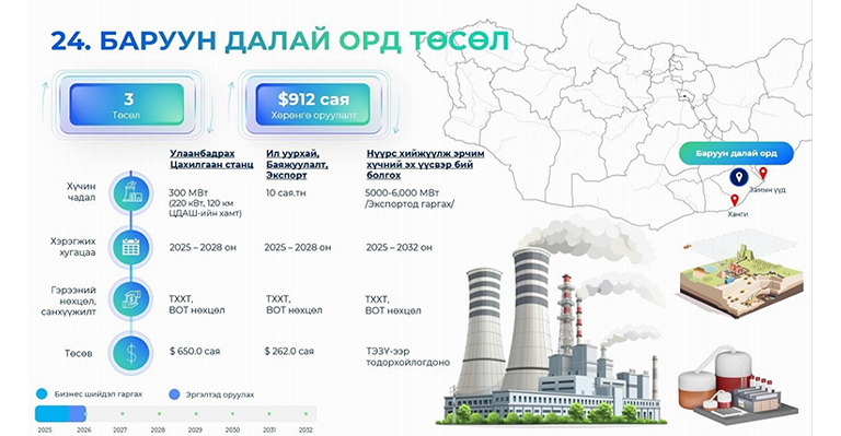 Мөн “Улаанбадрах 300 МВт цахилгаан станц” төслийг дагасан Баруун далай ордыг ашиглах ил уурхайн төслийн ТЭЗҮ-ийг боловсруулж дуусган, ТЭЗҮ-ийг “Эрдэнэс Монгол” нэгдлийн Техник технологийн зөвлөлийн хурлаар хэлэлцэн дэмжээд байна. Цаашид “Эрдэс баялаг мэргэжлийн зөвлөл”-ийн хурлаар оруулж, хэлэлцүүлэхээр бэлтгэл ажлыг хангаж буй аж.