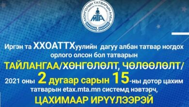 Татварын байгууллагаас Хувь хүний орлогын албан татварын тайланг хуулийн дагуу ирэх сарын 15-ны дотор авах талаар мэдээллээ. Улмаар дээрх хуулийн хөнгөлөлт, чөлөөлөлт эдлүүлэхэд…